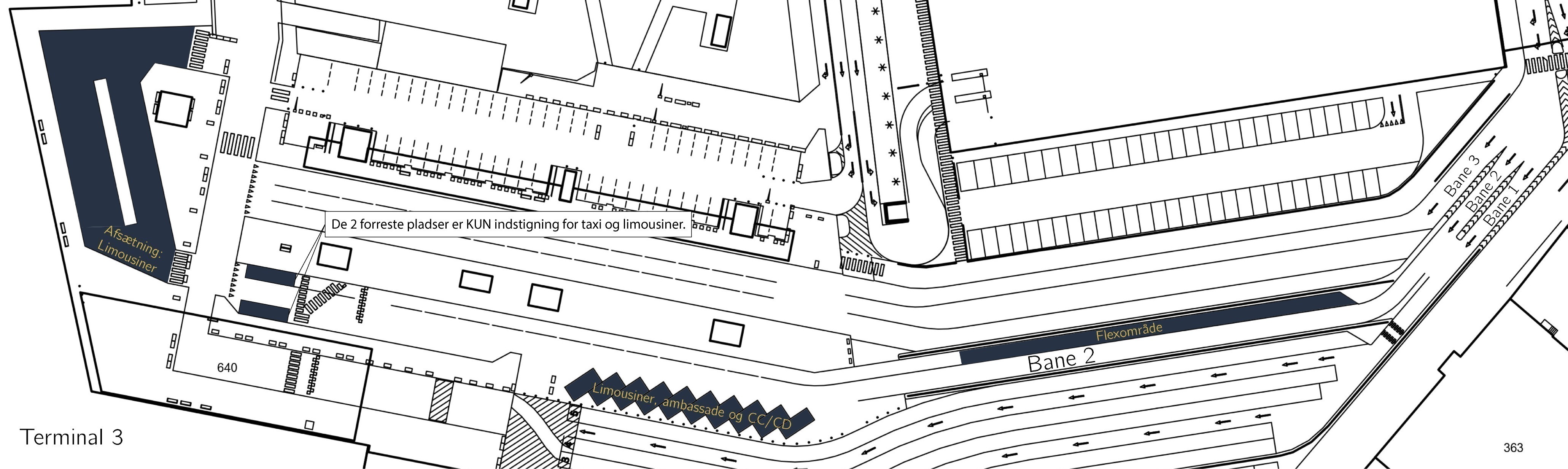 I inderste spor tættest på terminalen er der afsætning for taxi og limousiner.