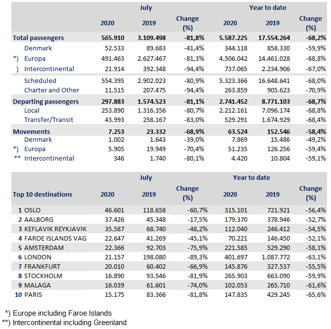 The top-ten destination countries in July were Norway with 67,015 passengers, Germany (53,965), Denmark (domestic flights) (52,533), Spain (45,384), Iceland (35,587), France (27,972), Great Britain (25,282), Greece (24,588) and the Faroe Islands (22,647).