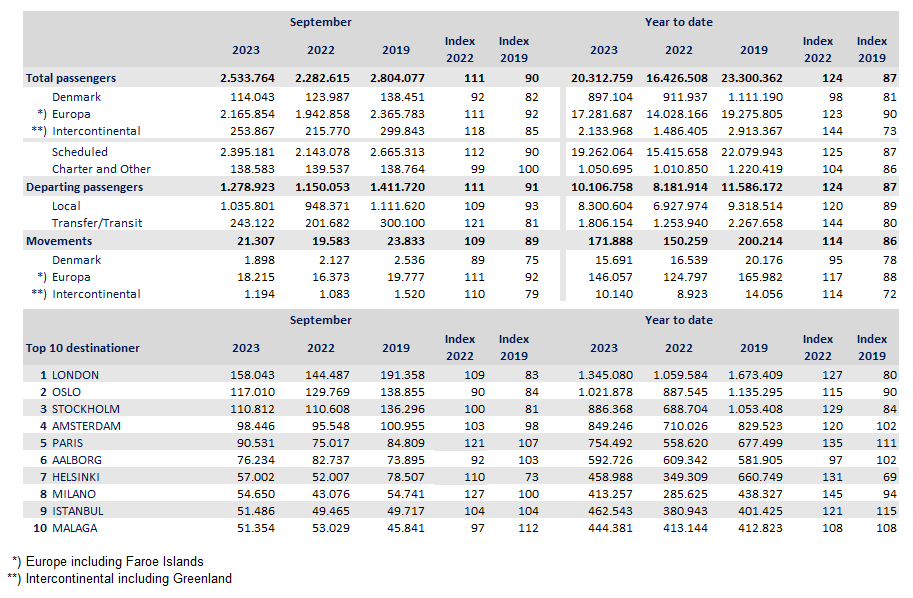 London is firmly in first place among the Top 10 destinations out of Copenhagen. In September,158,000 passengers travelled to or from the British airports of Heathrow, Gatwick or Stansted.