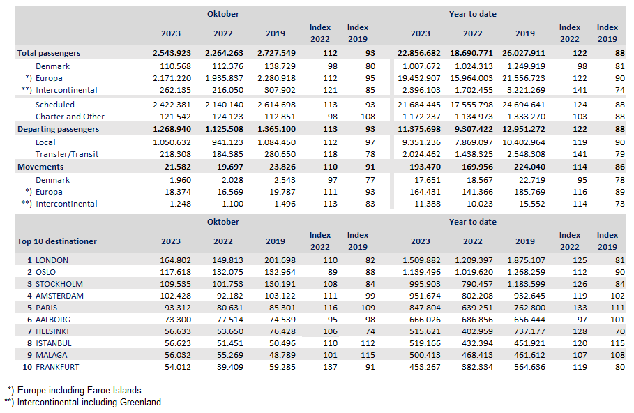 The passenger number for October was up by 12 per cent over the same month last year, when Copenhagen Airport registered 2.3 million travellers.