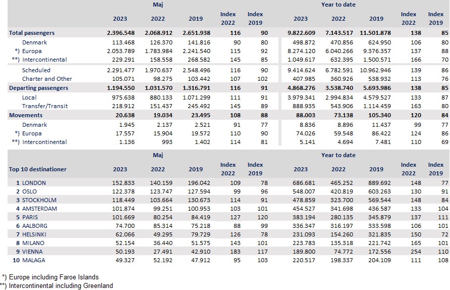 A total of 2,396,270 passengers travelled through Copenhagen Airport in May, an increase of 415,000 on the previous month.