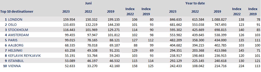 As always, London tops the list of the ten most popular destinations, with 160,000 travellers in June, followed by the two major Nordic destinations, Oslo and Stockholm. European hubs like Amsterdam, Paris and Vienna are also in the top ten.