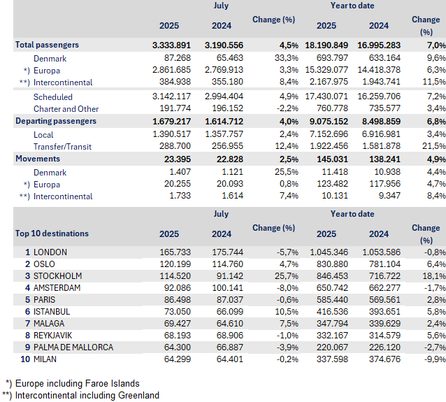 “We are very pleased with the high travel activity we saw in July. Many Danes prioritise family time during their holidays, when they can travel together. At the same time, many international guests choose Denmark as their destination. This development strengthens both aviation and tourism, and we are seeing how Copenhagen Airport contributes to the growth of the experience economy – both as a gateway to Denmark and as a starting point for travel around the world,” says Chief Commercial Officer Peter Krogsgaard of Copenhagen Airports A/S.