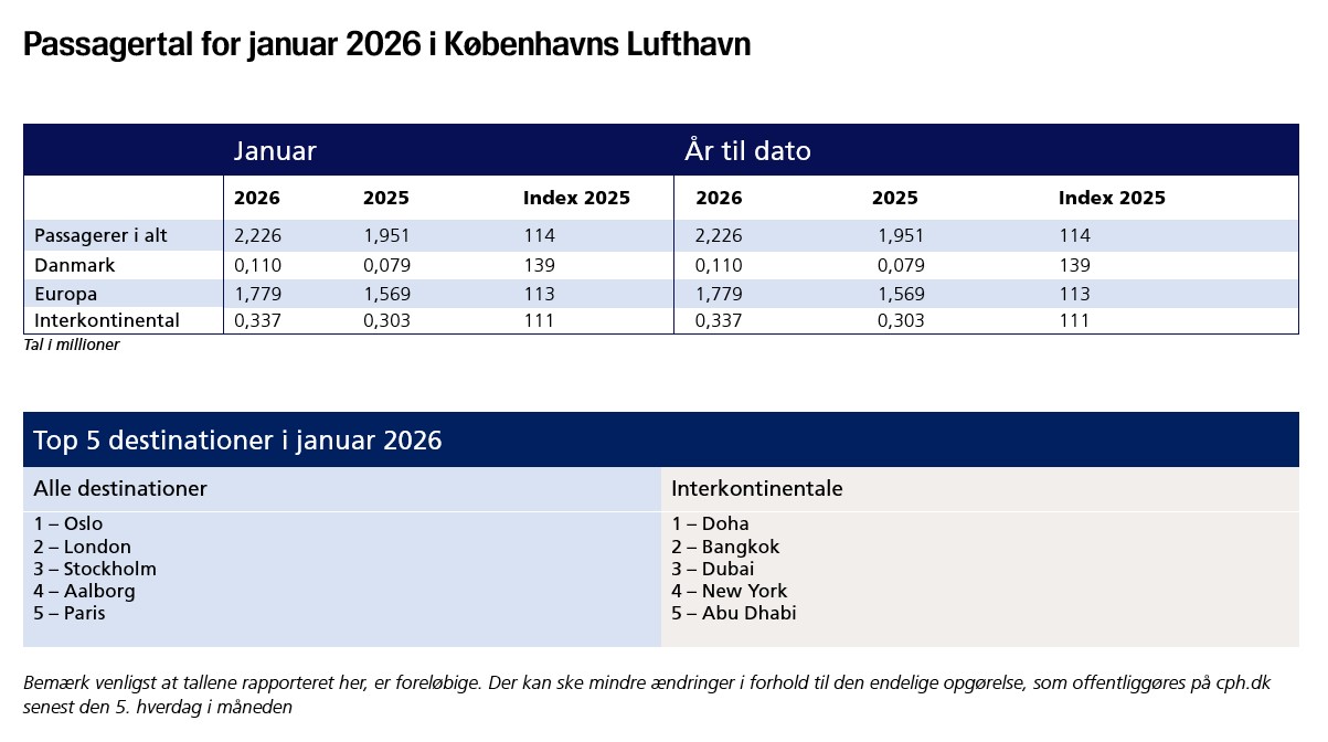 “The winter cold has truly taken hold here in Denmark, prompting many to escape the snow and frost in favour of sun and warmth in Thailand and Spain. We have had a strong start to the year and have never before seen more than two million travellers pass through the airport in January,” says Peter Krogsgaard, Chief Commercial Officer at Copenhagen Airport.