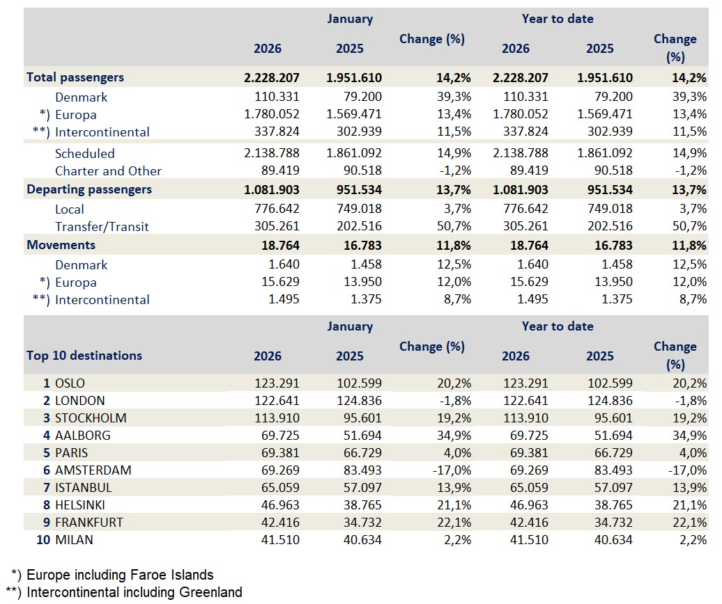 A total of 2.2 million passengers passed through Copenhagen Airport in January, representing a 14 per cent increase on last year and marking the highest January figure ever recorded. The proportion of new and more modern aircraft types at Copenhagen Airport has risen, so that more than one in three aircraft operating at the airport are now models that compared to earlier generate less noise and emissions.