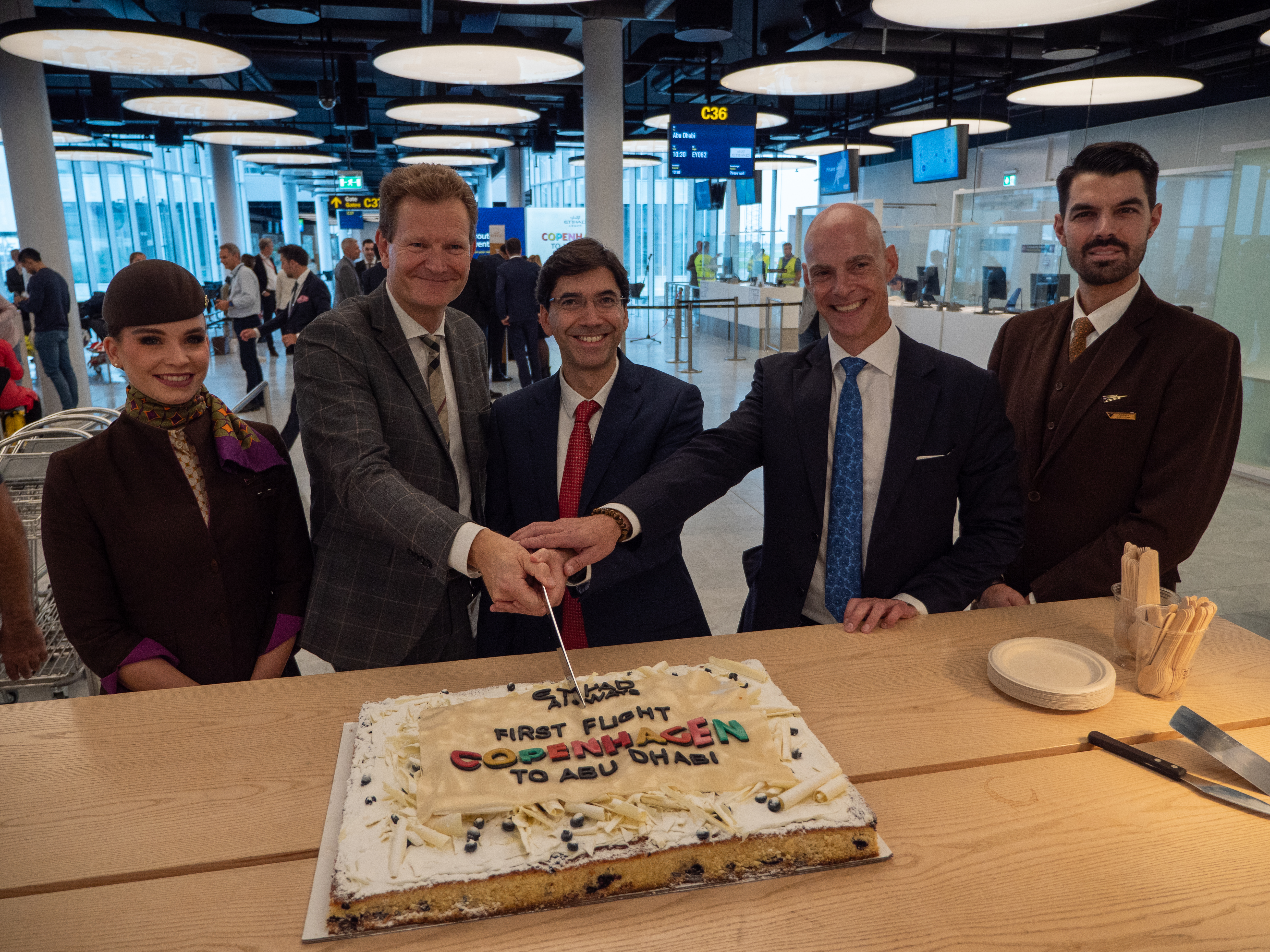Today marked the inauguration of Etihad’s new service between Copenhagen and Abu Dhabi. The flight was marked with celebrations at the departing gate, with speeches from Raffael Quintas, Chief Financial Officer at Etihad Airways, Morten Mortensen, Director of Airline Sales, and Route Development at CPH, as well as Christian Poulsen, Senior Vice President & COO at CPH. Afterward, the passengers of today’s flight were treated to fresh juices from JOE & THE JUICE, and cake from Lagkagehuset.