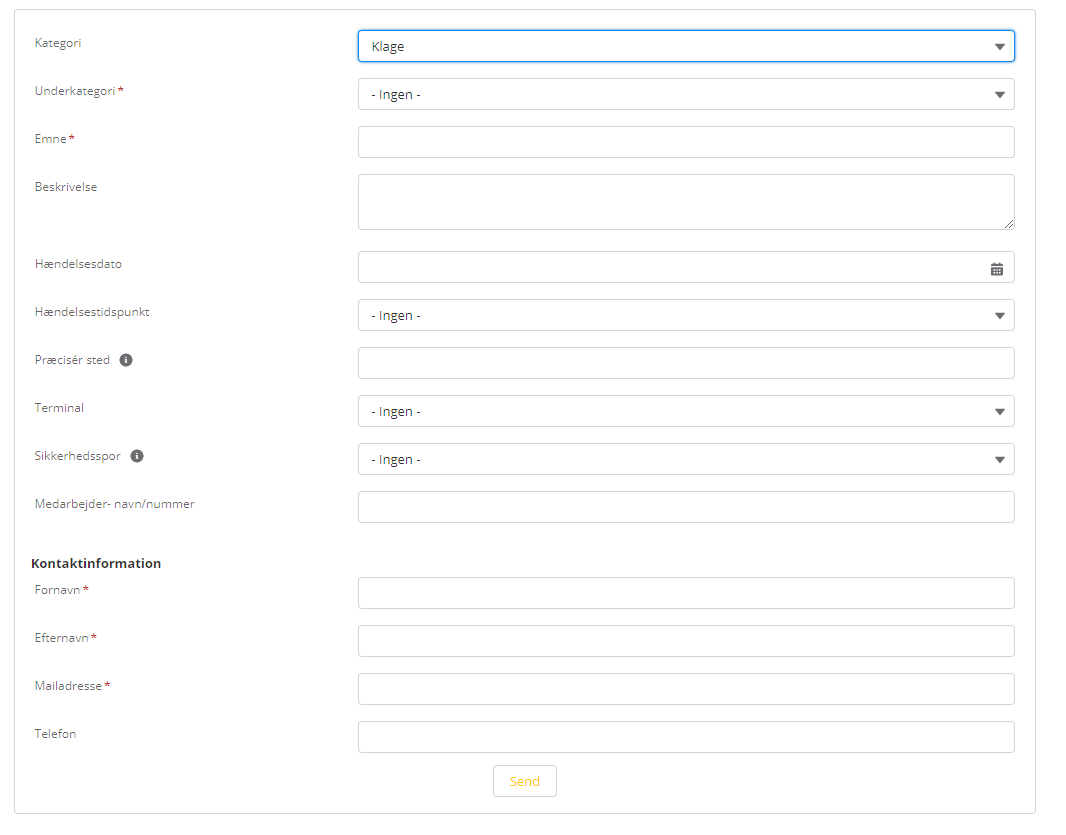 Hvis din klage drejer sig om en oplevelse i sikkerhedskontrollen, og du har modtaget et kontaktkort af personalet, beder vi dig udfylde alle oplysningerne fra kontaktkortet i denne kontaktformular. Vælg her "Sikkerhedskontrol" som underkategori.