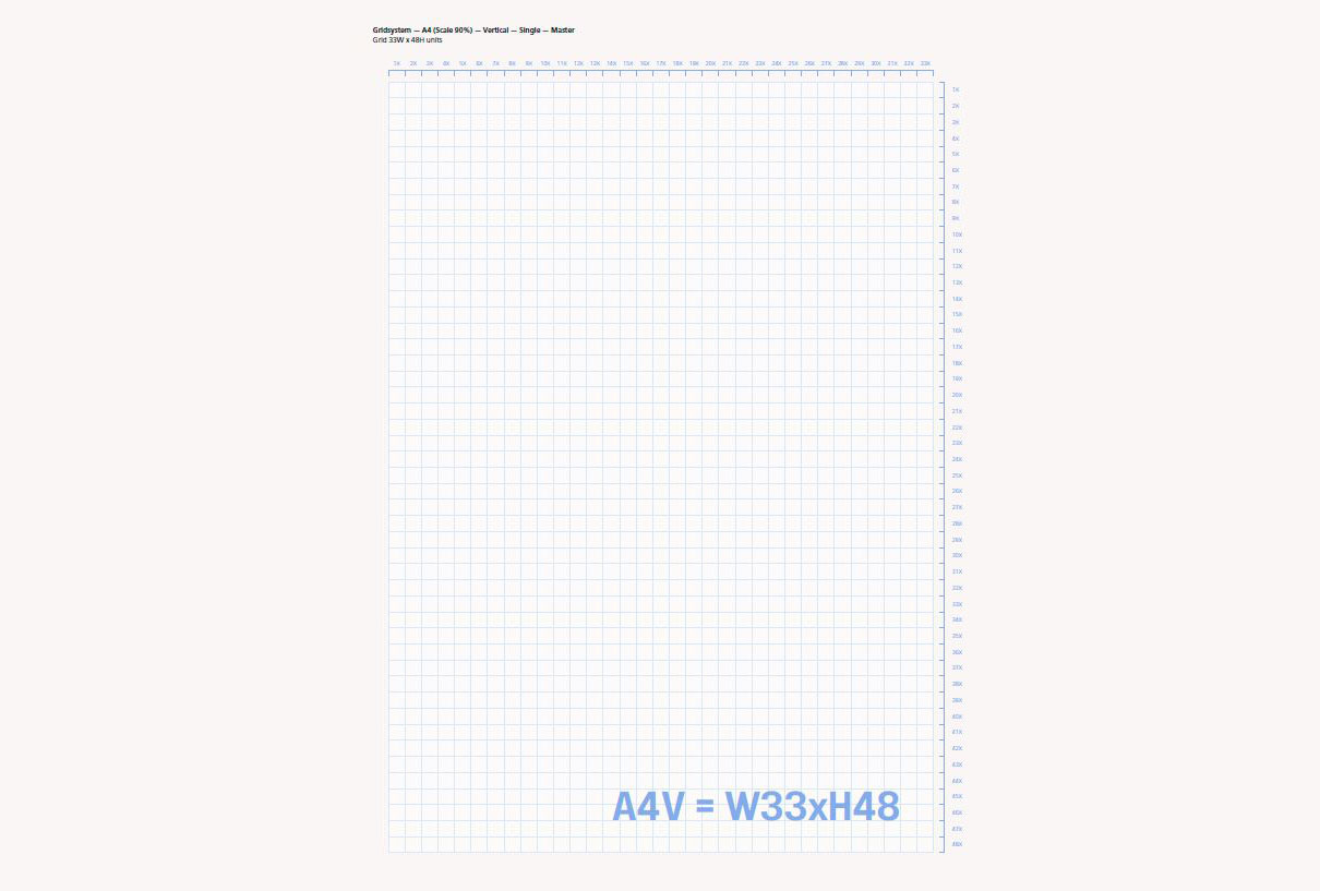 For A4-formatet anvendes et grid på 33W x 48H enheder. Margener defineres med to enheder i top, bund og på begge sider. Det giver fleksibilitet i layoutet og sikrer et genkendeligt og professionelt udtryk.