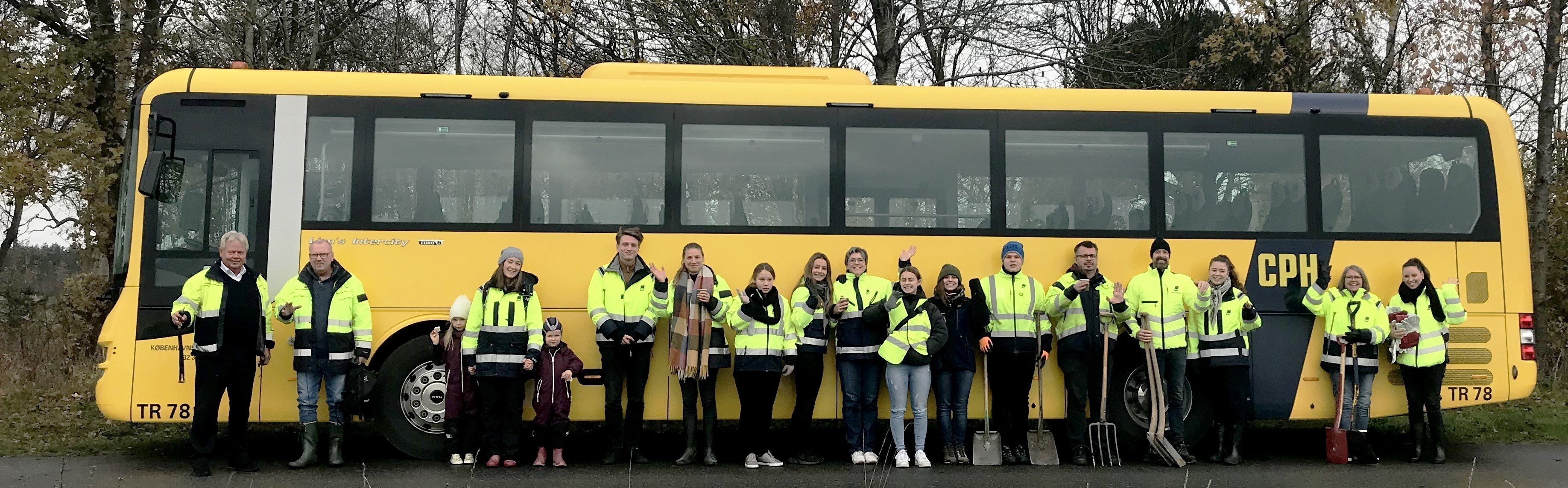 En gul bus fra Københavns Lufthavn kørte søndag den 10. november en masse af lufthavnens medarbejdere til Hillerød, så de kunne være med til at plante nogle af de 5.000 træer Københavns Lufthavn har doneret til Danmark Planter Træer.