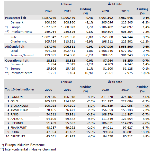 I alt var der i februar 1.987.766 passagerer gennem Københavns Lufthavn, svarende til en nedgang på 0,4 pct. Men på grund af skudår var der 29 dage i februar 2020, og korrigerer man for den ekstra dag i år, var den reelle nedgang på 3,7 pct.