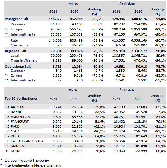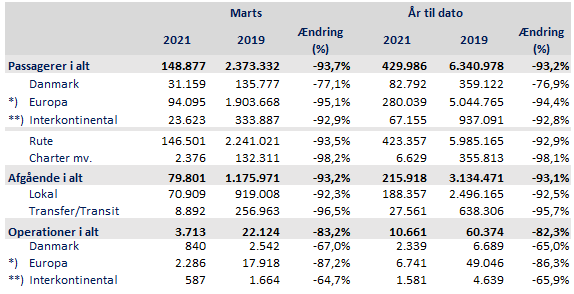 Marts måned endte med i gennemsnit 4.800 rejsende dagligt, selvom der var lidt mere aktivitet i dagene op til påske. Samlet var der 148.877 rejsende, et fald på 93,7 procent i forhold til 2019. Sammenlignet med 2020, hvor grænserne blev lukket den 14. marts, udgjorde faldet 82,5 procent.