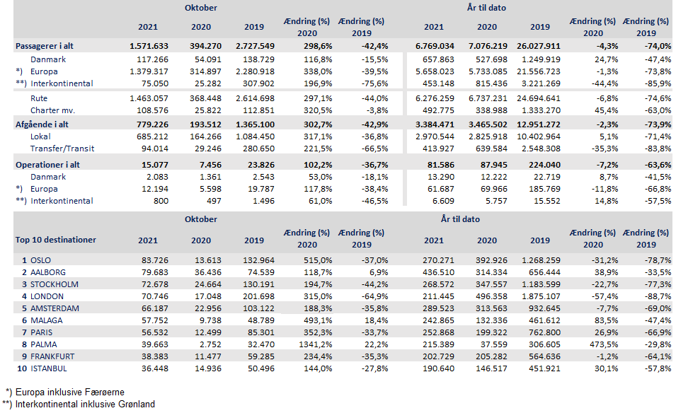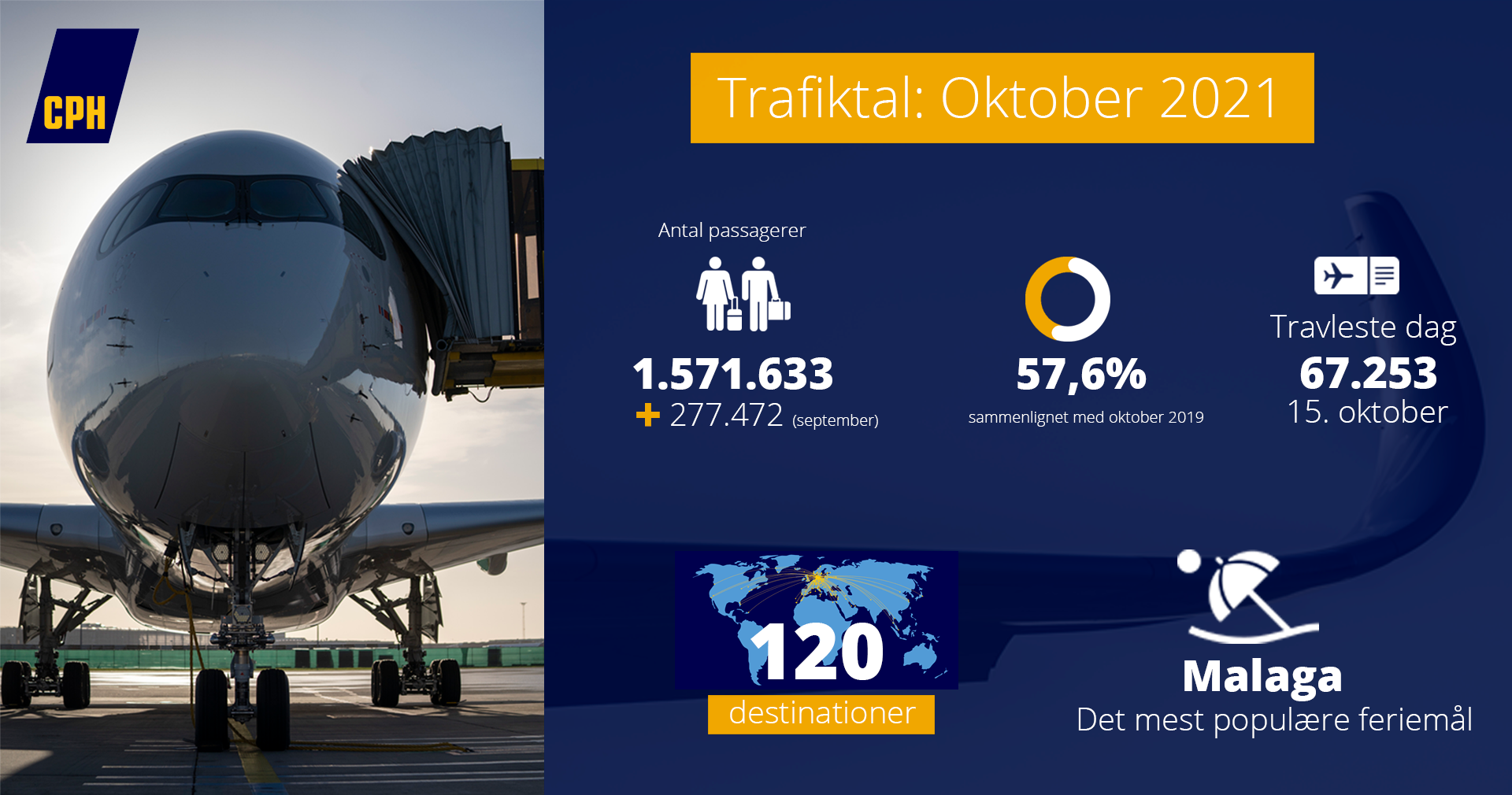 1.571.633 personer rejste igennem terminalerne. Det svarer til 57,6 pct. af aktiviteten i oktober 2019, som var det seneste normale år før pandemien. Ved indgangen til november var der 120 destinationer at vælge imellem fra Københavns Lufthavn – primært i Europa og Skandinavien.