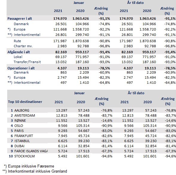 Med de nuværende rejserestriktioner og en hel verden i rød, er det ikke overraskende de europæiske og oversøiske ruter, der er hårdest ramt. Normalt tegner udenrigsruterne sig for 94,5 pct. af trafikken i CPH. I årets første måned var 85 pct. af de få flyvninger til destinationer udenfor Danmarks grænser.