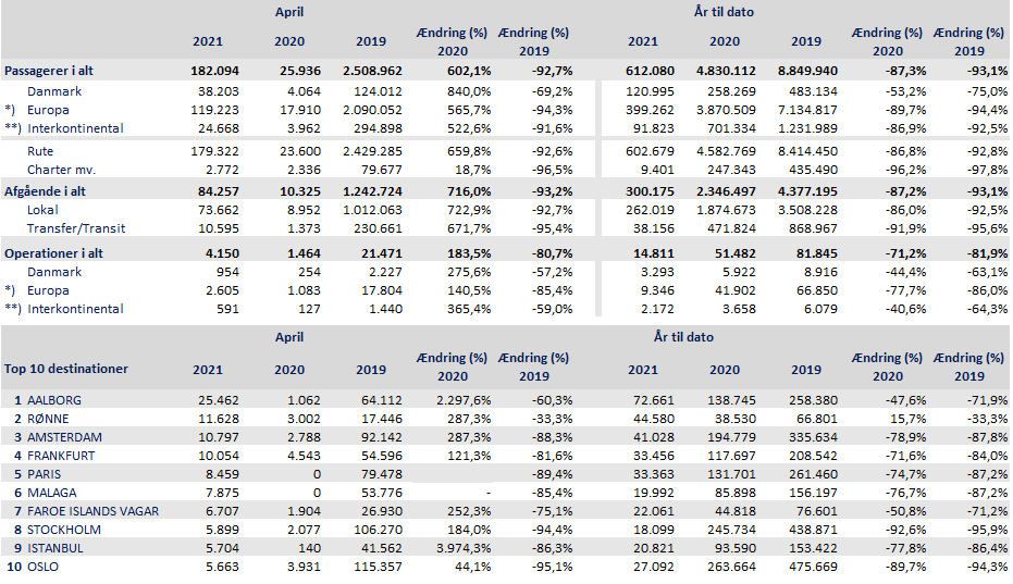 April blev tæt på den koldeste måned i 35 år. Også i Københavns Lufthavn var den internationale trafik frosset helt til efter endnu en måned med rejsevejledninger i rødt. Der blev talt 182.094 rejsende, et fald på 92,7 procent i forhold til april 2019. Aalborg var igen suverænt største destination. Nu gør CPH klar til sommertrafikken.