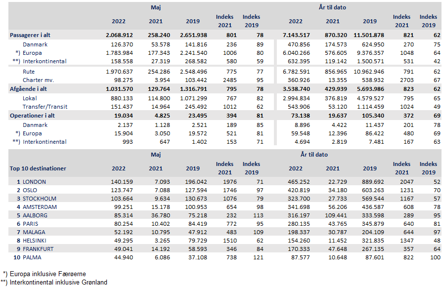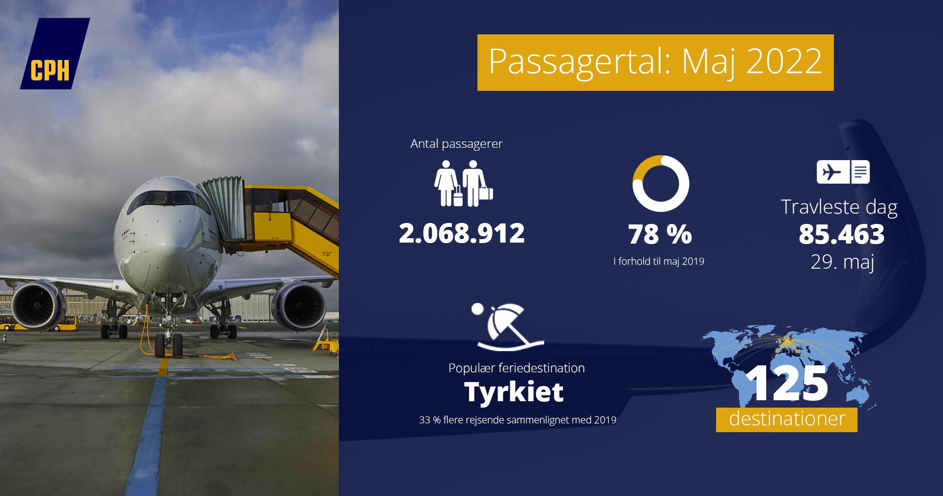 Der blev sat flere rekorder i maj. Søndag den 29. blev den mest travle dag siden Coronaen ramte med 85.453 passagerer på Kr. Himmelfarts-feriens store hjemrejsedag. Og samlet blev maj måned med 2.068.912 rejsende også den mest travle, siden pandemien sendte luftfarten i frit fald. Dermed er passagertallet på indeks 78 i forhold til normalen.