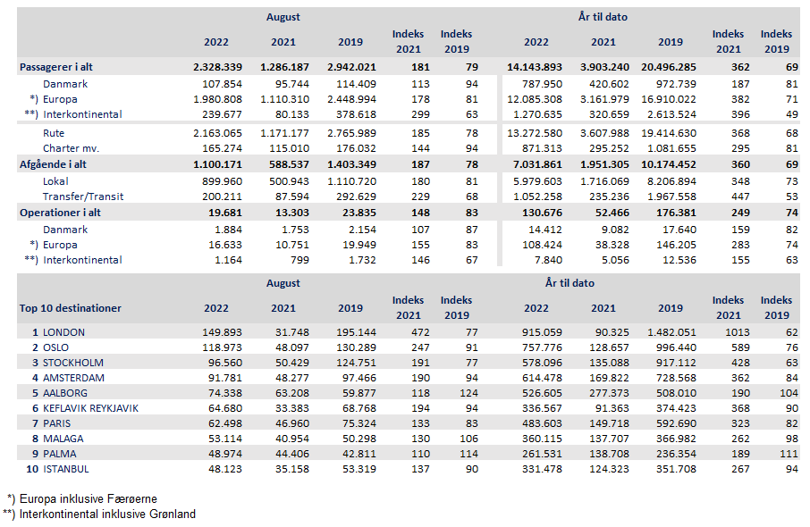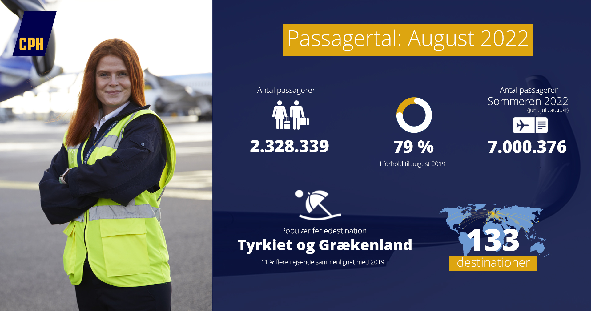 Sommerferien er forbi for de fleste. For Københavns Lufthavn har det været tre travle sommermåneder med 7.000.376 passagerer i juni, juli og august. Alene i august rejste 2.328.339 til og fra Københavns Lufthavn. Det svarer til, at otte ud af 10 passagerer er tilbage efter corona.