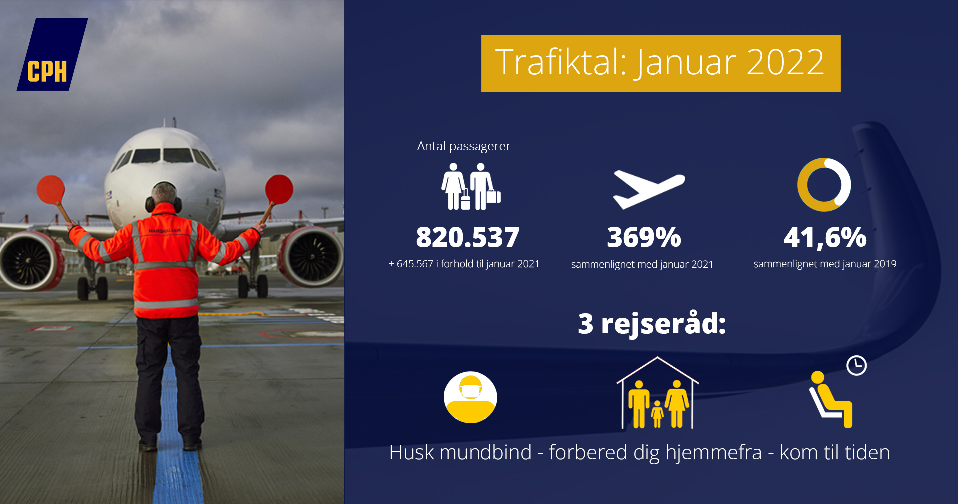 Januar er traditionelt en stille måned. Det var den også i år med 820.000 rejsende i terminalerne, omkring 40 procent i forhold til 2019. Nu venter en travl vinterferie. Der er tre vigtige råd: Husk mundbind i terminalerne, forbered dig grundigt og kom til tiden.
