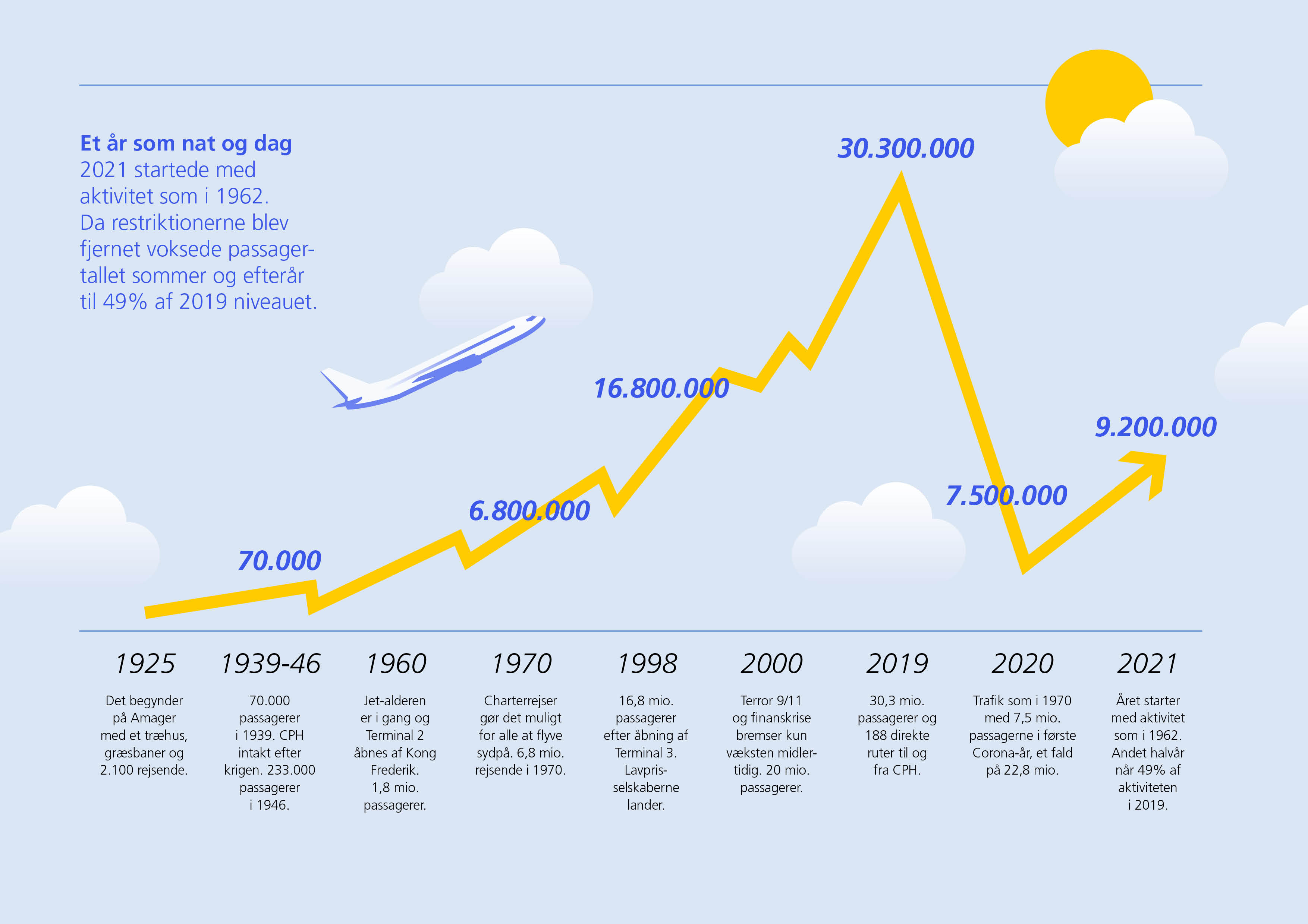 9.179.654 passagerer rejste igennem Københavns Lufthavn i 2021. Det svarer til knap en tredjedel af aktiviteten før COVID-19, men var dog 22% flere end i 2020.