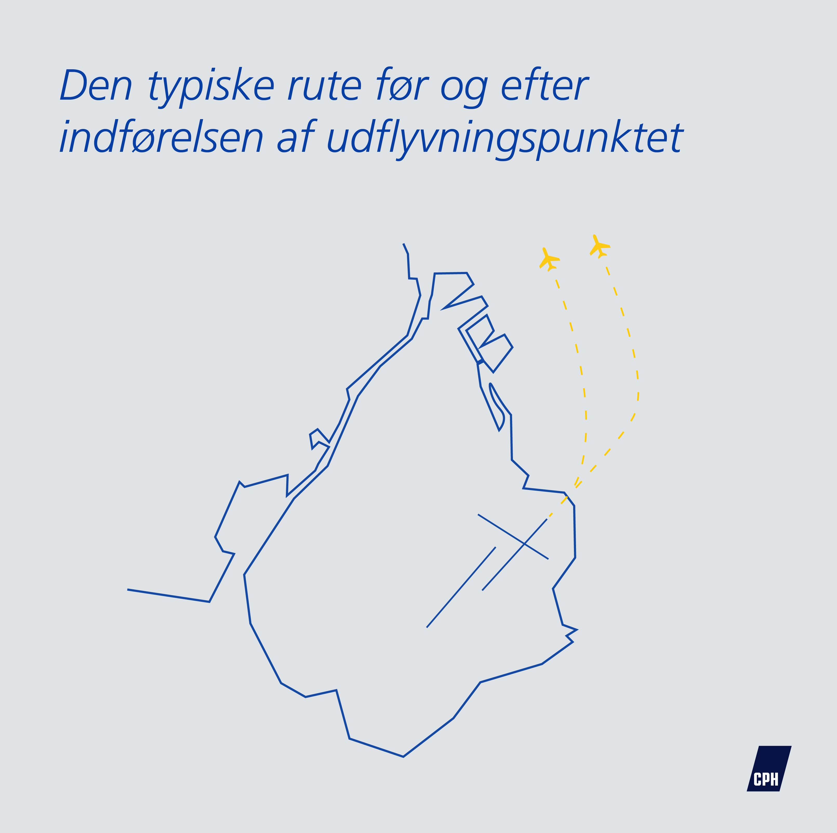 I samarbejde med Naviair, der varetager flyveledelsen af det danske luftrum, har Københavns Lufthavn derfor oprettet et såkaldt udflyvningspunkt et stykke ude over Øresund. Det er et punkt, som det enkelte fly ledes ud til, når standardproceduren følges, før det drejer. Nu viser data fra det første halve år, at tiltaget virker – at langt størstedelen af de pågældende fly befinder sig længere væk fra naboerne nord for lufthavnen.
