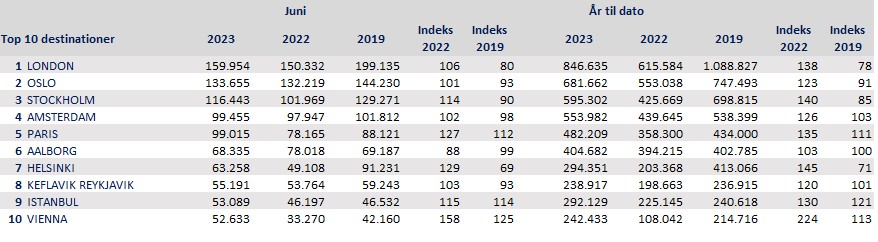 På den samlede top 10 over destinationer ligger London som altid i top med 160.000 rejsende i juni fulgt at de to store nordiske destinationer Oslo og Stockholm. Europæiske trafikknudepunkter som Amsterdam, Paris og Wien er også på listen.