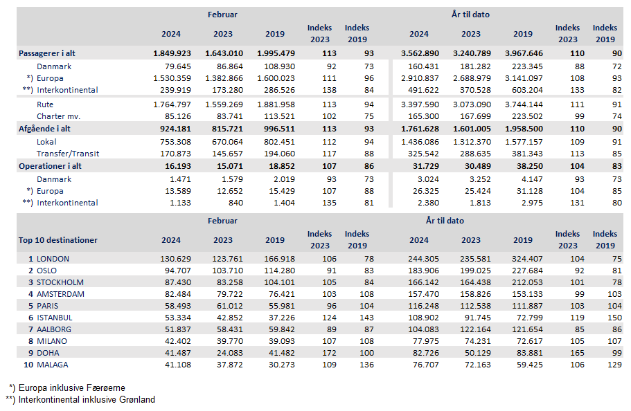 Flere end 1,8 millioner rejsende var gennem Københavns Lufthavn i februar. Det er en stigning på 13 procent i forhold til sidste år, og passagervæksten ser ud til at fortsætte i 2024. Forude venter foråret og en travl påske, hvor mange rejser på ferie.