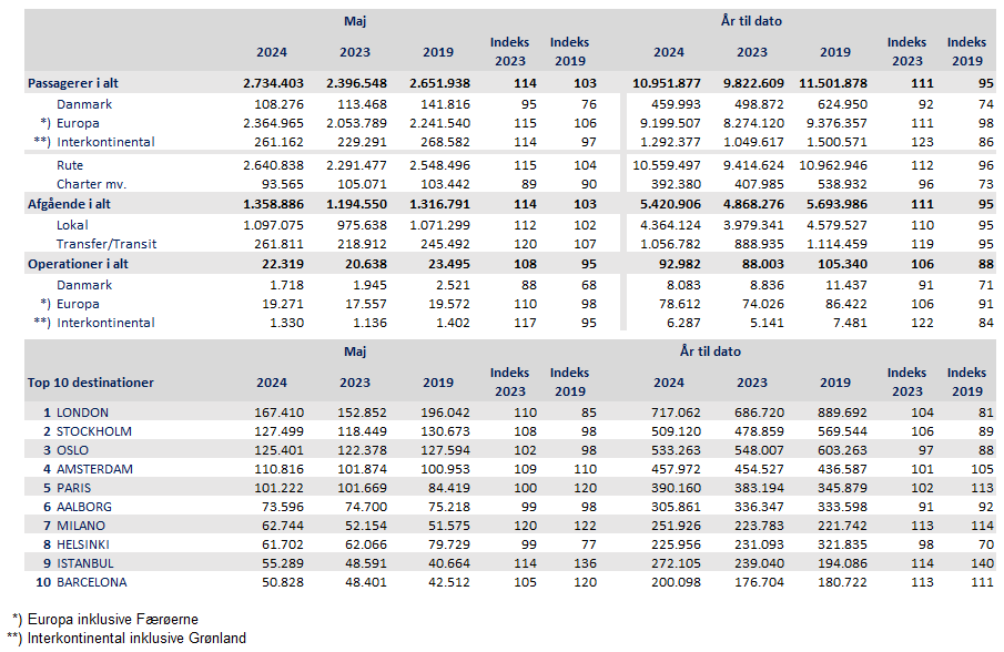 Det samlede passagertal for maj ender på 2.734.403, hvilket er hele 14 procent højere end samme periode sidste år. Væksten er bl.a. et resultat af, at SAS, Norwegian og Ryanair i maj oplevede passagerstigninger på mellem 18 og 27 procent i forhold til samme måned sidste år. Som sædvanlig er London højdespringeren på top-10-listen, men også storbyer som Amsterdam, Milano og Istanbul er på listen over de mest populære rejsedestinationer.