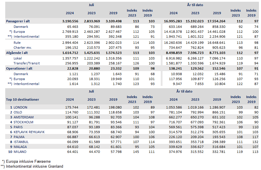 Juli blev den travleste måned nogensinde i Københavns lufthavn. Flere end tre millioner passagerer rejste gennem terminalerne, og hele seks gange blev den oprindelige passagerrekord for en enkelt dag i lufthavnen slået. Selv om rejselysten stiger, var der ni procent færre fly i luften på årets største rejsedag end på den travleste rejsedag i 2019.