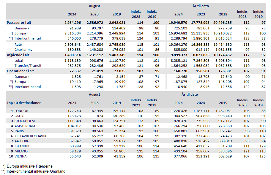 I august lettede og landede 22.153 passagerfly i Københavns Lufthavn, mens antallet i august 2019 var 23.261. Det svarer til, at der var fem procent færre fly i luften i august men det samme antal passagerer gennem lufthavnen. Belægningsgraden, altså hvor mange flysæder der i gennemsnit er fyldt ud fra København, var på hele 81,0 procent i august i år mod 79,0 procent i 2019.