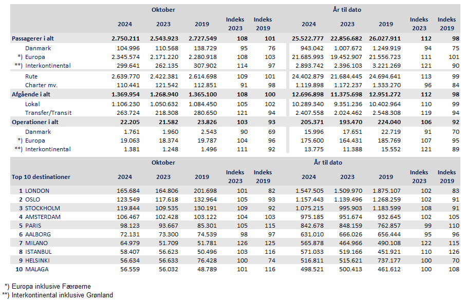 2,7 millioner passagerer rejste gennem Københavns Lufthavn i oktober, som blev den travleste efterårsmåned nogensinde. På trods af rekordmange rejsende er antallet af passagerfly, der letter og lander i Københavns Lufthavn, lavere end for fem år siden. Flyselskaberne har netop taget hul på vintertrafikprogrammet, som byder på 229 ruter ud af København.