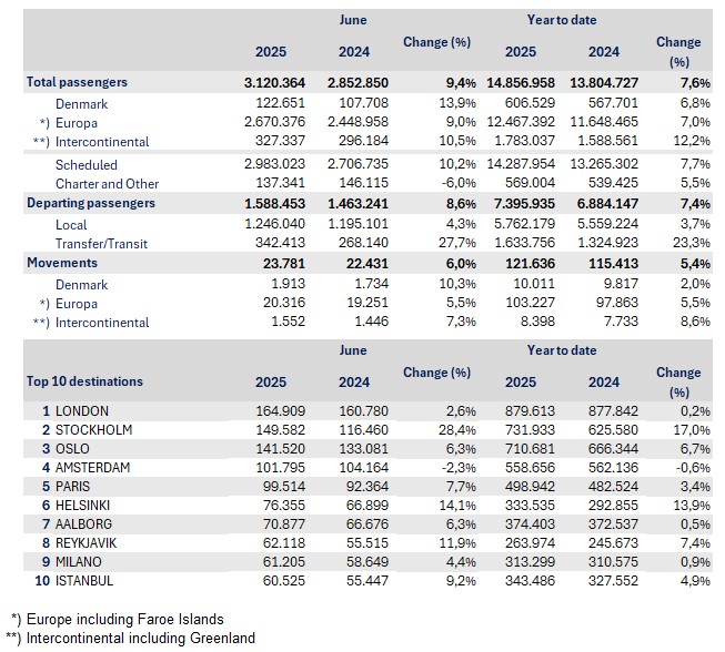 Ruterne til Europa udgjorde 86 procent af trafikken i juni, mens 330.000 passagerer rejste på en af de 41 langdistanceruter, der er til og fra København – herunder to nye ruter til Seattle og Minneapolis, som betjenes af henholdsvis SAS og Delta Air Lines.