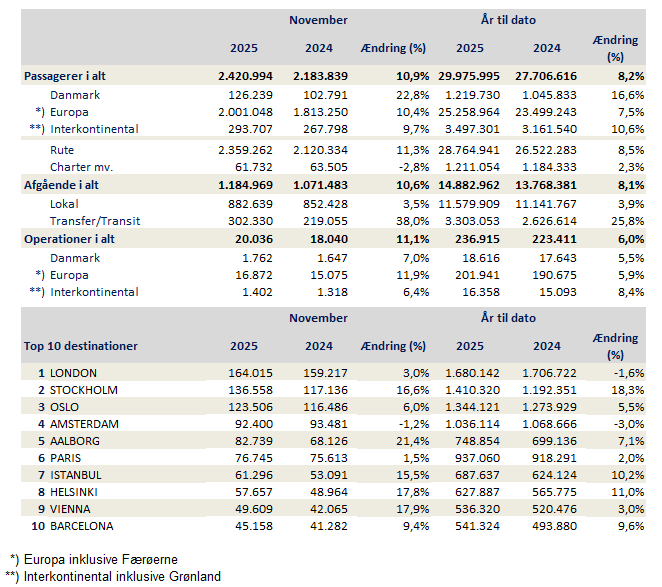 2,42 millioner passagerer rejste gennem Københavns Lufthavn i november – en stigning på 11 procent i forhold til samme måned sidste år. Det er det højeste antal novemberrejsende nogensinde. Væksten bliver især drevet af transfertrafik, hvor hver fjerde passager nu skifter fly i København.