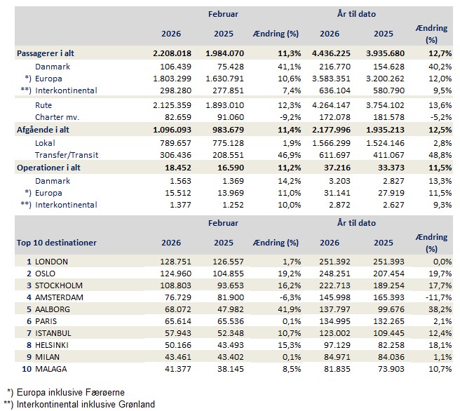 2,2 millioner passagerer var gennem Københavns Lufthavn i årets korteste måned. To vinterferieuger med mange rejsende og et generelt stigende antal transferpassagerer betyder, at det blev den travleste februar i lufthavnen nogensinde. Uroen i Mellemøsten skaber dog usikkerhed og har påvirket dele af flytrafikken i slutningen af måneden.