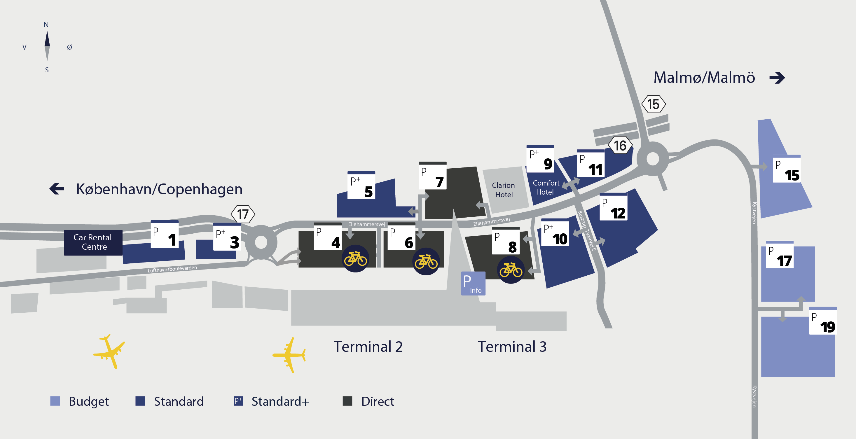 Ved Terminal 2 er der cykelparkering ved P4 og P6, og ved Terminal 3 finder du cykelstativerne ved P8, som du frit kan benytte dig af.