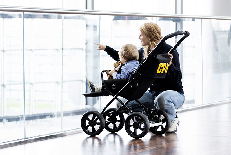 Mærke til klapvognen: Såfremt personalet godtager, at du må have klapvognen med, printer de et særligt mærke som skal være synlig på klapvognen ombord på flyet.