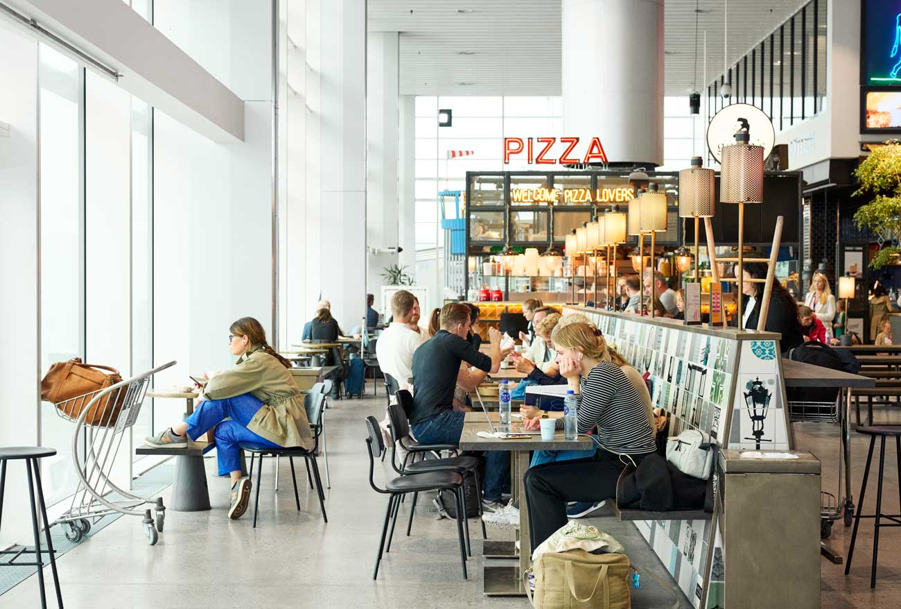 I lufthavnens food court, som er et område med madsteder mellem gates A & B samt ved gates C, er der et større areal med siddepladser, og ved de fleste borde er der også mulighed for opladning.
